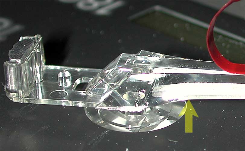 黄色い矢印部分をよく見ても特に裏板をひっかけるような凸部分は見あたりません きっと黒い針カバーが浮き上がらないようにするための板なのでしょう